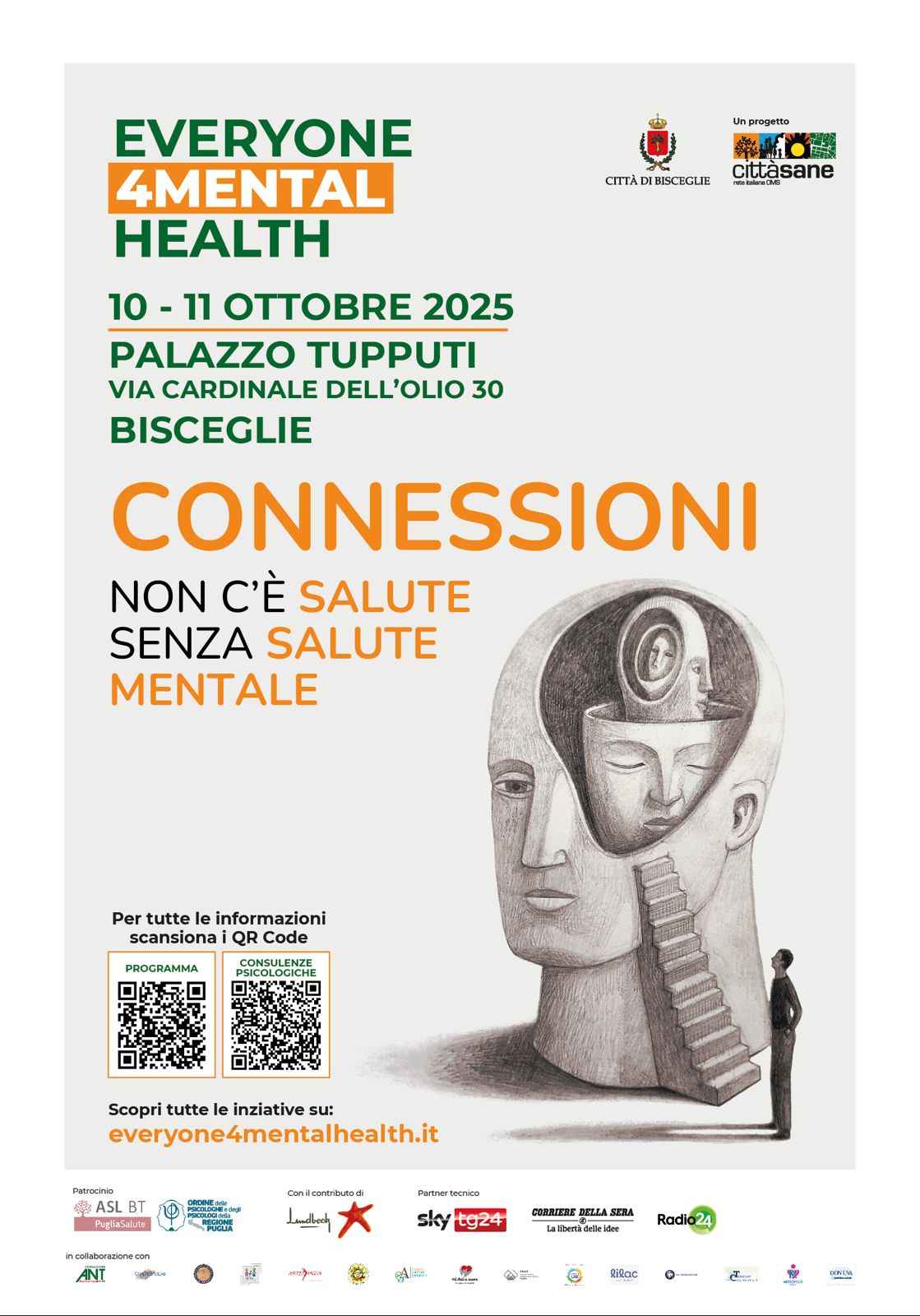 Promuovere la conoscenza e la sensibilizzazione sui temi della salute mentale, favorire l’integrazione tra le realtà territoriali e rafforzare le reti di sostegno alla persona: sono questi gli obiettivi della rassegna “Connessioni”, in programma a Bisceglie venerdì 10 e sabato 11 ottobre 2025, organizzata dall’Amministrazione Comunale in collaborazione con la Rete Italiana Città Sane – OMS, con il patrocinio di ASL BT e Ordine degli Psicologi di Puglia, e con la partecipazione del Liceo Scientifico “Leonardo da Vinci” e di numerose associazioni ed enti del terzo settore.