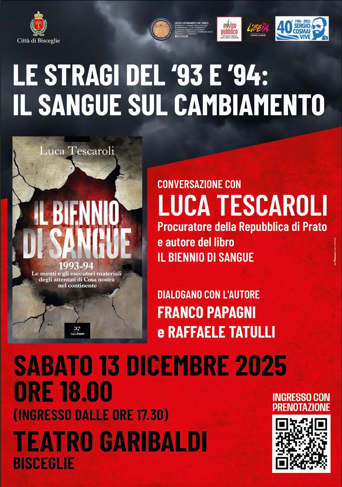 Bisceglie accoglie Luca Tescaroli, Procuratore della Repubblica di Prato e magistrato che, nel corso della sua carriera, ha dedicato un impegno centrale alla ricostruzione giudiziaria delle stragi mafiose del 1993-94. L’appuntamento è fissato per sabato 13 dicembre al Teatro Garibaldi, con apertura delle porte alle 17:30 e inizio della conversazione alle 18:00. L’ingresso è gratuito, con prenotazione obbligatoria fino ad esaurimento posti al link: https://forms.gle/BimDwhZ118bE1e4e8.