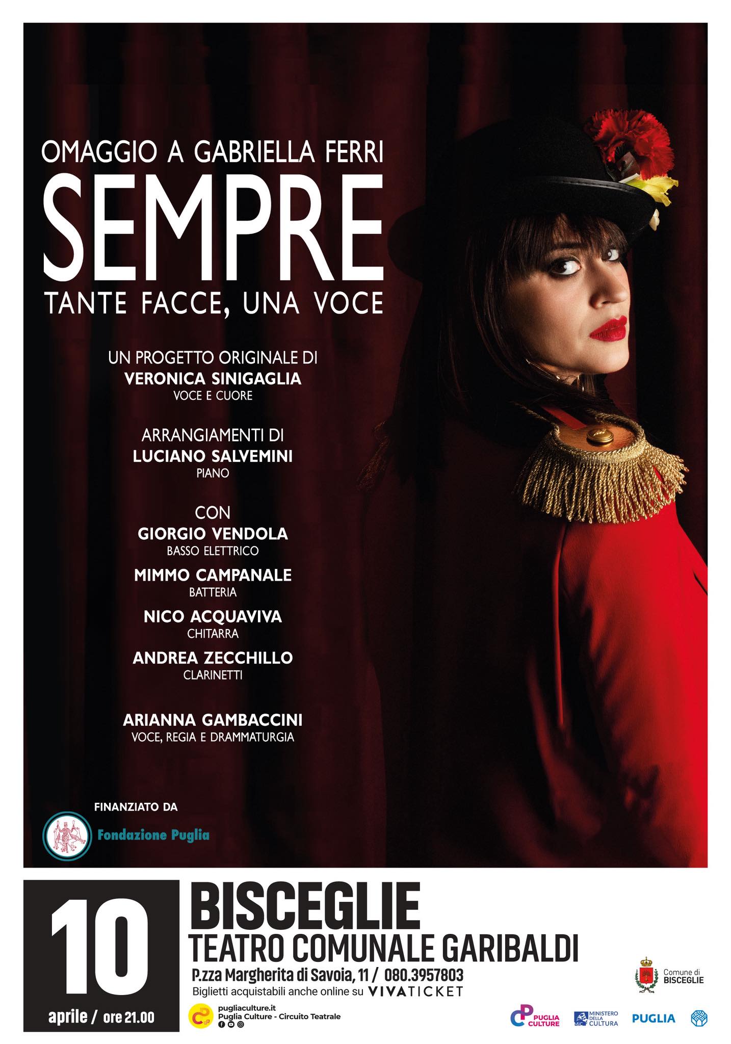 Attraverso arrangiamenti originali e una costruzione scenica essenziale ma evocativa, “Sempre – Tante facce, una voce” propone una nuova prospettiva sul repertorio della Ferri, valorizzando il legame tra tradizione e modernità e coinvolgendo lo spettatore in un’esperienza emotiva e culturale.